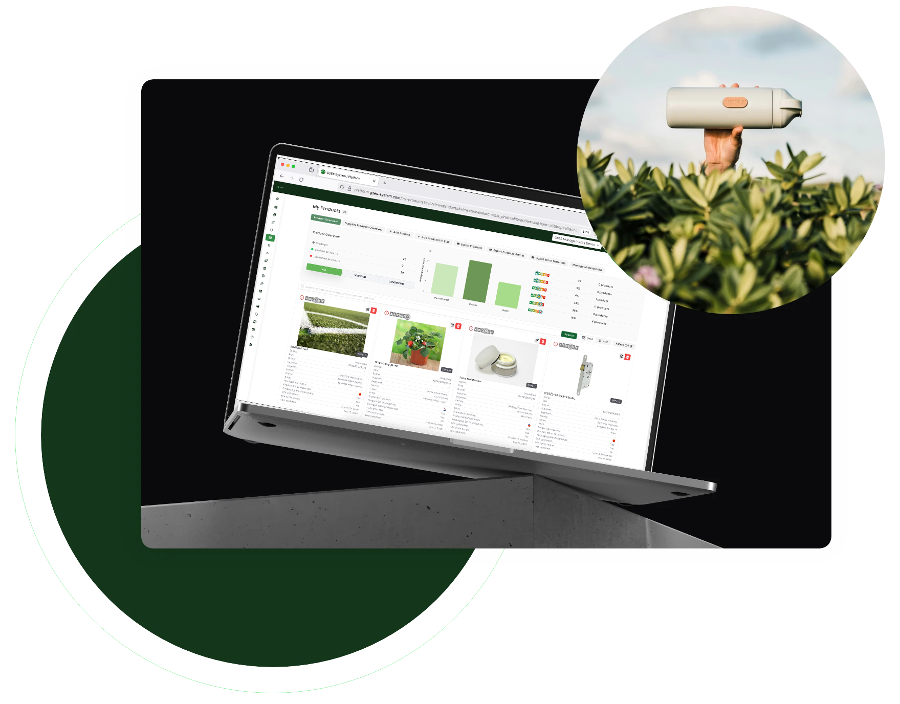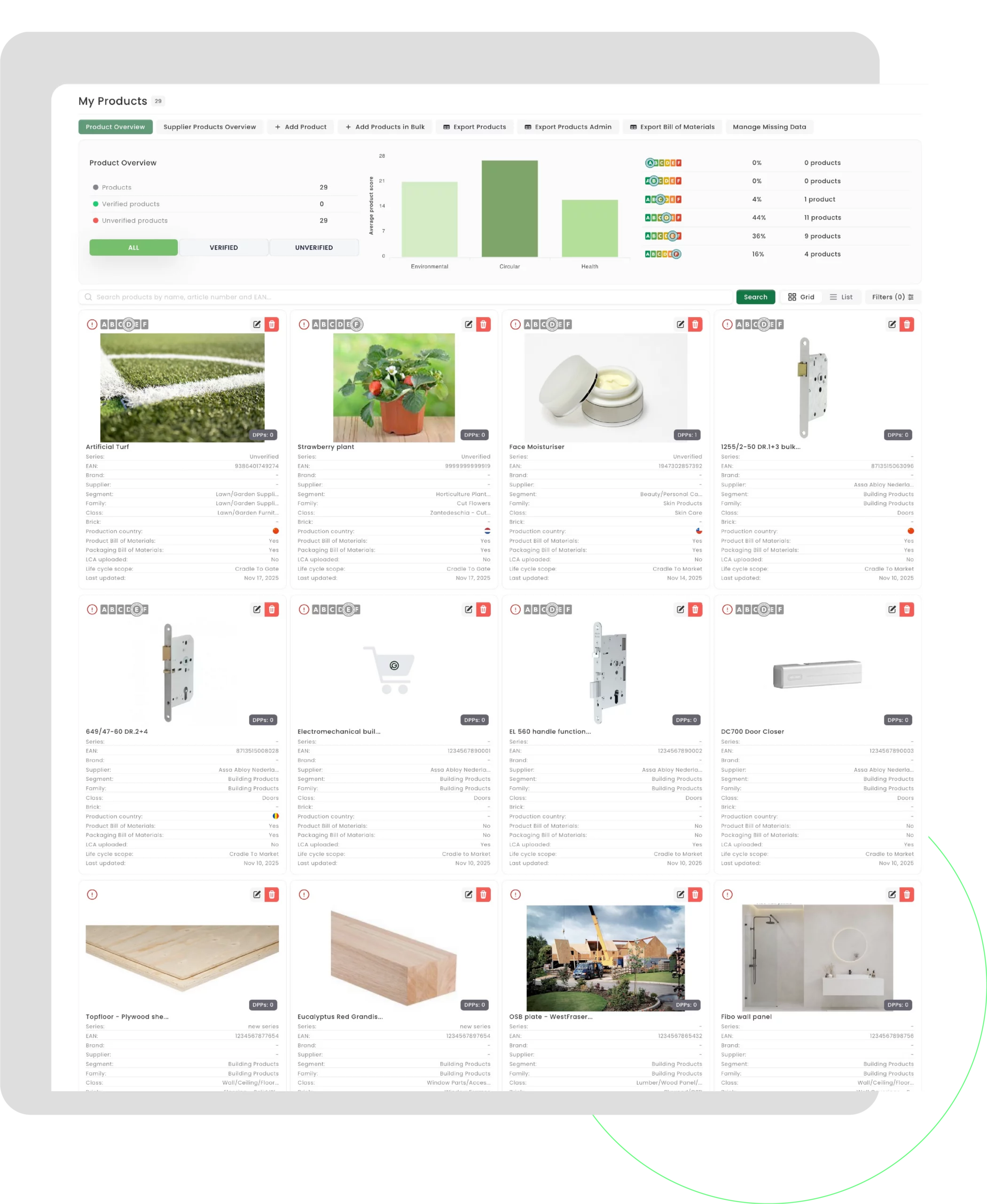 Import your product portfolio and analyze product scores using verified reports and certification data.